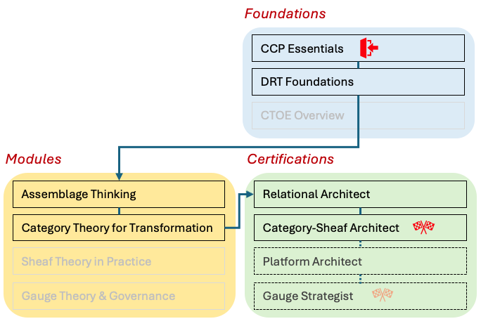 Begin with CCP Essentials and DRT Foundations, which establish fluency in relational systems thinking. Progress to Assemblage Thinking and Category Theory, which sharpen analytical depth and prepare candidates for formal assessments. The pathway culminates in the Relational Architect and CategoryโSheaf Architect Certifications, where learners demonstrate applied mastery and earn a recognized credential. Optional advanced tracks like the Gauge Strategist or Platform Architect further extend credibility, positioning participants as specialists in cutting-edge organizational design.