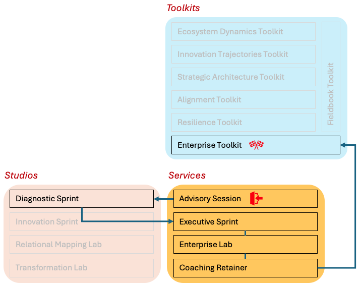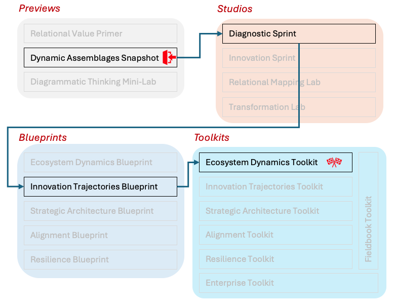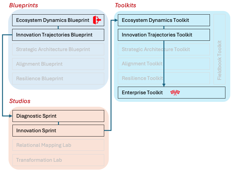 The journey begins with the Ecosystem Dynamics and Innovation Trajectories Blueprints, equipping leaders and consultants with core frameworks to train their teams or clients. These flow directly into the Diagnostic Sprint and Innovation Sprint, productized services that demonstrate value through client pilots. To scale impact, the Ecosystem Dynamics Toolkit, Innovation Toolkit, or full Enterprise Toolkit provide white-labeled portals and dashboards, enabling repeatable delivery across units or markets. This pathway transforms one-off interventions into scalable, IP-backed programs.