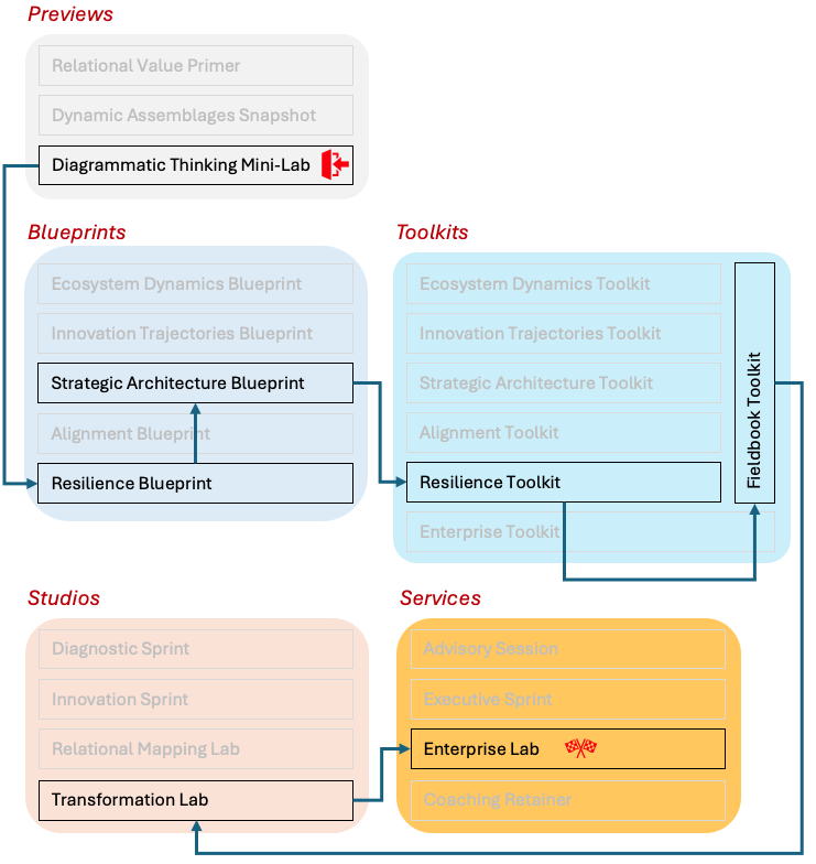 The Diagrammatic Thinking Mini-Lab introduces scenario-based foresight and systems mapping in an accessible way. The Resilience and Strategic Architecture Blueprints deepen this work by providing frameworks for adaptive governance and scenario planning. The Resilience Toolkit and Fieldbook Toolkit scale these practices with dashboards and reusable templates. For high-stakes contexts, the Transformation Lab supports multi-stakeholder pilots around systemic risks, while the Enterprise Lab enables governments and enterprises to co-create durable foresight strategies. This pathway equips organizations to anticipate, absorb, and adapt to disruption proactively.
