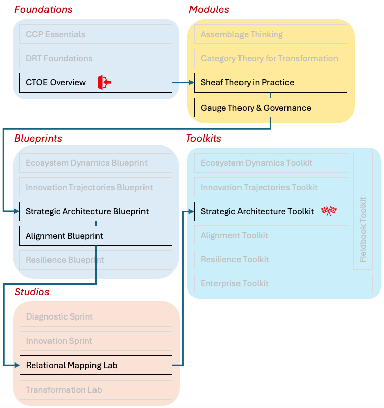 The CTOE Overview introduces participants to the blueprinting methods that will guide their design work. Building on this, Sheaf Theory in Practice and Gauge Theory & Governance translate abstract concepts into tools for balancing global visions with local realities and detecting systemic drift. The Strategic Architecture and Alignment Blueprints then deepen capability with design-focused frameworks for restructuring organizations. These prepare the ground for the Relational Mapping Lab, a hands-on studio where teams co-create maps and interventions. Finally, the Strategic Architecture Toolkit institutionalizes these methods with reusable templates and dashboards, ensuring design capability persists beyond the lab.