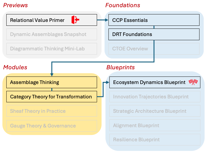 The Relational Value Primer creates a quick shift in mindset, introducing teams to value-in-use and relational thinking. From there, CCP Essentials and DRT Foundations provide a structured foundation in co-creation and dynamic relationality, anchoring a shared vocabulary. The Assemblage Thinking and Category Theory for Transformation modules then give participants practical conceptual tools to map interdependencies and flows. Finally, the Ecosystem Dynamics Blueprint integrates these ideas into a diagnostic lens, enabling organizations to spot misalignments and establish a coherent framework for change.
