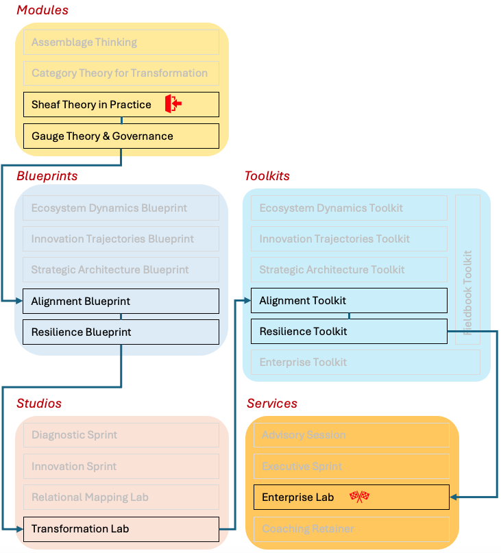 The pathway opens with Sheaf Theory in Practice, introducing the logic of reconciling local differences with global strategies. The Alignment and Resilience Blueprints then provide applied systemic tools for managing tensions and designing adaptive policies. The Transformation Lab takes this further, enabling organizations to co-create alignment pilots across multiple stakeholders. To institutionalize outcomes, the Alignment Toolkit and Resilience Toolkit deliver ongoing dashboards and scenarios. Finally, the Enterprise Lab expands the work into broader, multi-stakeholder systemic initiatives, embedding coherence into the fabric of governance.